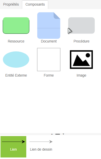 Dans l’onglet Composants, retrouvez les objets que vous allez pouvoir utiliser dans le graphe du Processus.