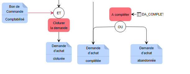Les liens de synchronisation : en rouge avec une flèche simple. Ils relient les documents avec les pré-conditions et type ET.Ils signifient que l’opération n’est possible sur le document/état qui la déclenche (flèche noire) que si le document synchronisé (flèche rouge) a atteint (au moins une fois en cas de cycle) l’état spécifié.