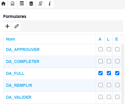 Le symbole formulaire permet de visualiser l’ensemble des formulaires associés à un document. A ce stade on peut redéfinir ou définir les formulaires par défaut en archivage “A”, lecture “L”, écriture “E” aasociés au document.