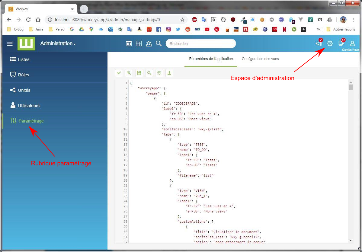 Un fichier JSON est tout simplement un fichier texte. Il est accessible en ligne au sein de l’application. Pour y accéder vous devez être connecté en tant qu’administrateur (Workflow Manager) et vous rendre dans l’espace d’administration, rubrique Paramétrage.