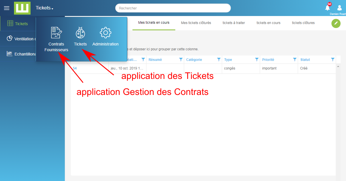 Ce tableau contient deux objets correspondant à deux applications, une qui gère les contrats et l’autre les tickets. Pour spécifier vos applications, consulter la Définition d’une application.