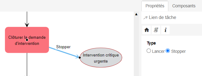 La modélisation de cette situation s’effectue en liant l’opération à l’évènement à supprimer, puis en changeant la propriété du lien de “Lancer” à “Stopper” :