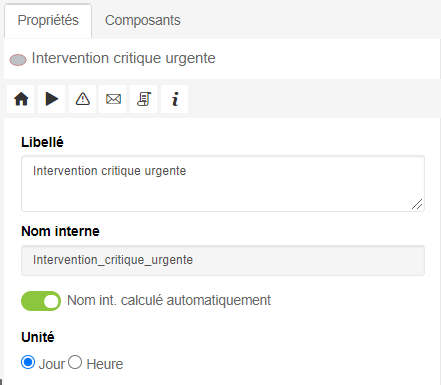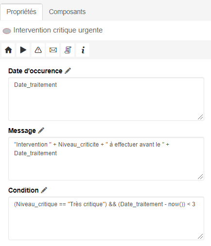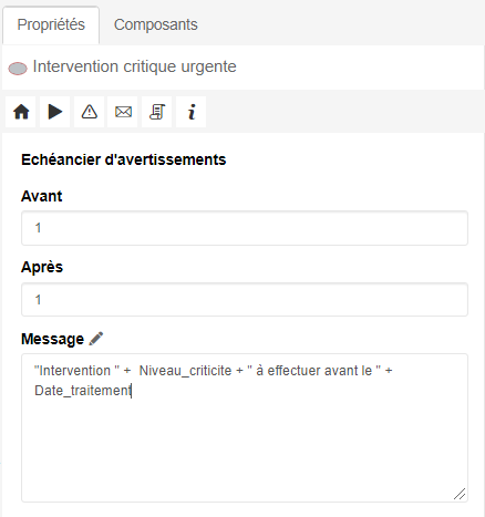 Message : Éditer le script retournant le texte du message expédié aux intervenants concernés lors de la survenance de l’évènement.Dans l’exemple, le script suivant a pour objet de rappeler la date de traitement prévue :"Intervention " + Niveau_criticite + " à effectuer avant le " + Date_traitement