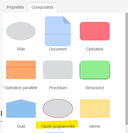 Dans la modélisation d’une Procédure, aller dans l’onglet “Composants” et sélectionner le composant “Tâche programmée” pour créer un nouvel évènement: