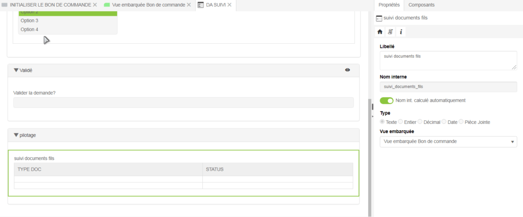 Une vue embarquée est une vue visible dans un document, donc comme “embarquée” dans ce document. C’est une vue qui permet de créer des documents fils à partir d’un formulaire et de montrer des documents créés à partir de ce document de référence.