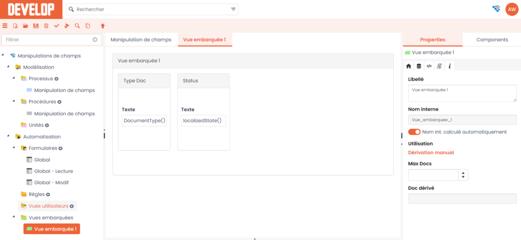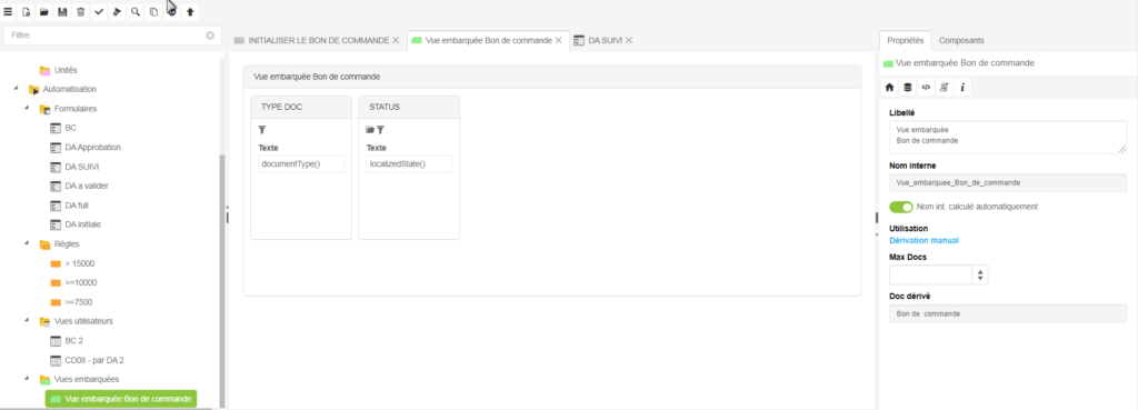 A la différence d’une vue autonome, une vue embarquée doit être créée dans un formulaire attaché à un document. La même vue peut apparaître dans plusieurs formulaires du même type de document, elle devient de ce fait visible par les utilisateurs accédant par ces formulaires.