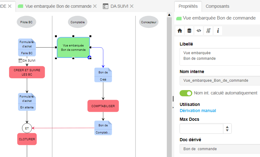De plus, la création de documents via une vue embarquée doit être spécifiée dans le modèle d’opérations, pour préciser à quel étape du flux, et donc à travers quel rôle, pourront être créés ces documents.
