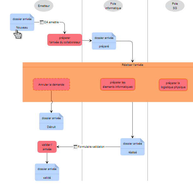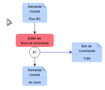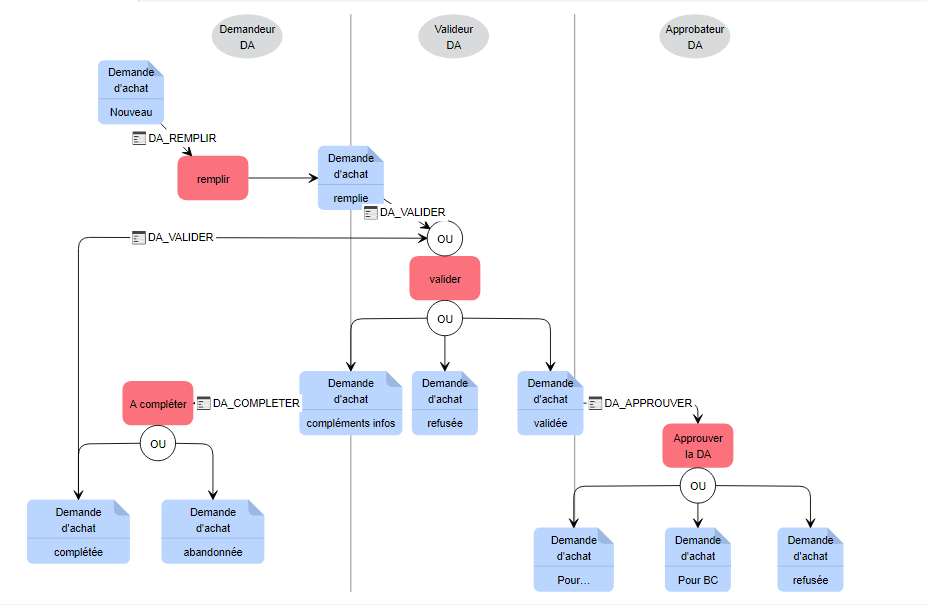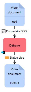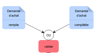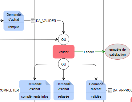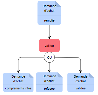 - une condition “OU” figure en dessous de l’opération: plusieurs états de document sont possibles en sortie de l’opération, le choix d’un état sera effectué soit par l’acteur effectuant l’opération, soit par une règle automatique,