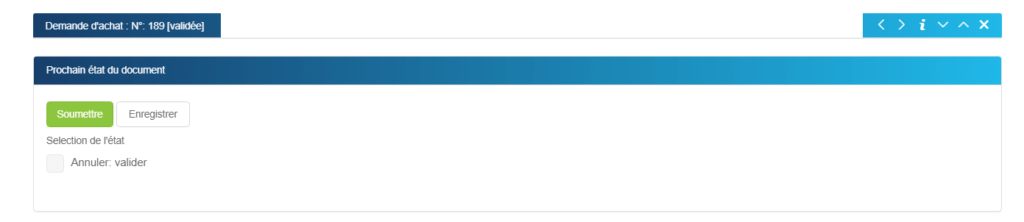 Il est par contre tout à fait possible de spécifier une règle pour tous les états: dans ce cas, on peut se trouver dans la situation où aucune des règles n’est satisfaite au moment de soumettre le document. Si c’est le cas, l’utilisateur, averti de l’échec de la vérification, peut modifier les données du document en cours et tenter une nouvelle soumission. Il peut également sauvegarder le document sous forme de brouillon et effectuer les corrections nécessaires plus tard.