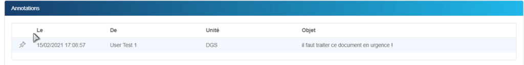 - A l’ouverture du document, une section “Annotations” est affichée, montrant à l’utilisateur courant les annonces reçues et émises par lui. La colonne ‘Objet’ reprend les 120 premiers caractères de la relance.