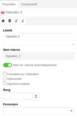 En éditant une opération, il est possible de renseigner des propriétés pour compléter le comportement attendu de cette opération. En plus des propriétés standards d’une opération, l’opération au sein d’une opération paralléle dispose d’une propriété supplémentaire : Le formulaire. Vous pouvez ainsi préciser pour chaque opération un formulaire distinct.