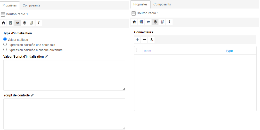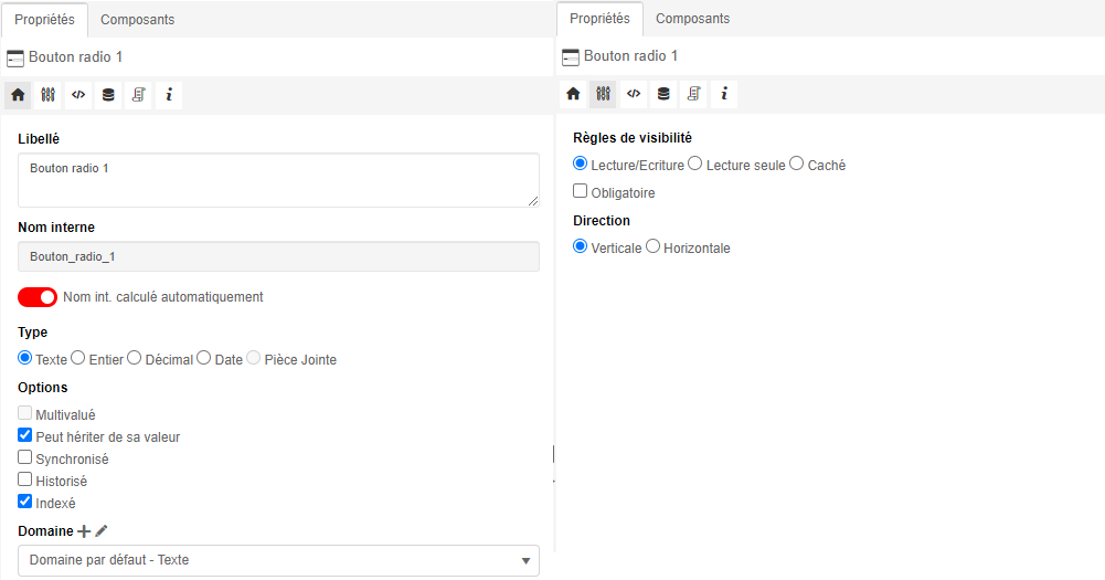 Le champ Bouton radio est une liste de choix dans laquelle l’utilisateur pourra sélectionner un élément. Son type est obligatoirement texte.