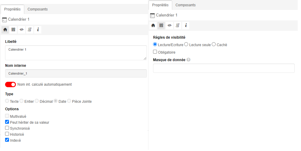 Calendrier est un champ de type Date dans lequel l’utilisateur peut sélectionner une date spécifique. Son type est obligatoirement date.