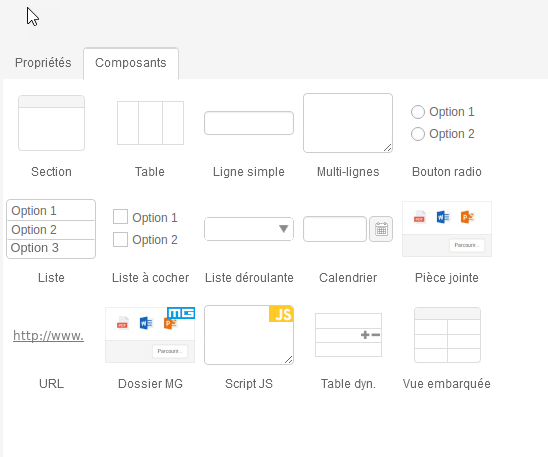 Les objets qu’il est possible d’utiliser dans les formulaires sont affichés lorsque l’utilisateur clique sur l’onglet “Composants”.