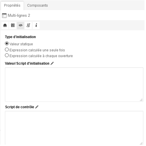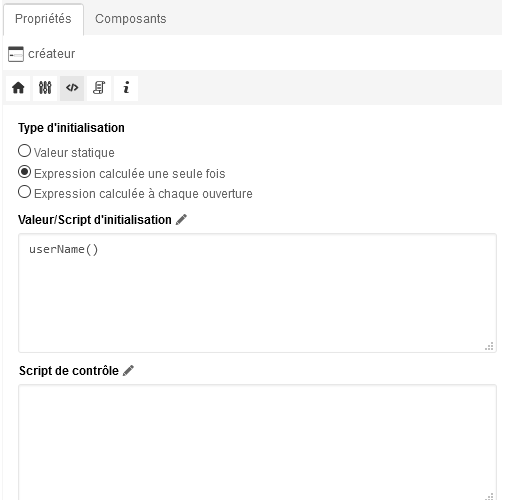 La Valeur par défaut prise par ce champ au chargement de la page peut être vide ou prédéfinie.Une Expression Stalk sera évaluée une seule fois au chargement de la page.Une Expression calculée sera réévaluée au chargement, à chaque rafraichissements et à la soumission de la page.