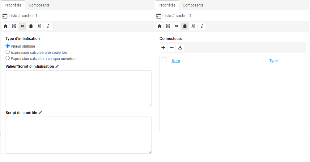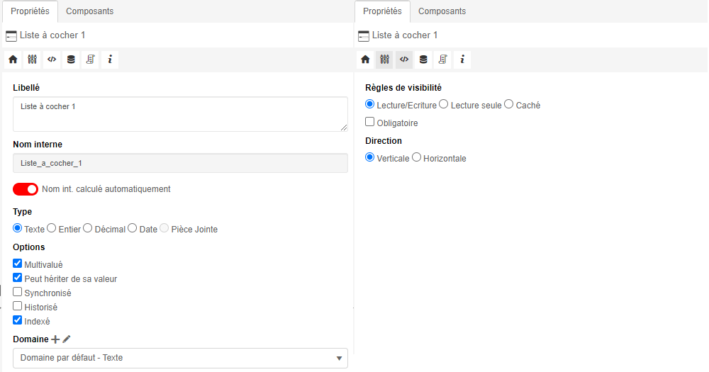 Le champ Liste à cocher est une liste de choix dans laquelle l’utilisateur pourra choisir un ou plusieurs éléments. Son type est obligatoirement texte.