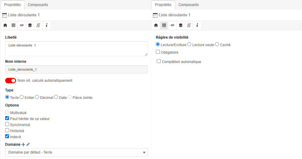 Ce champ peut avoir une valeur par défaut vide ou prédéfinie que l’utilisateur n’aura pas nécessairement besoin de modifier.Il peut être présenté en lecture seule ou en écriture. On peut aussi le définir comme obligatoire, le formulaire ne serait pas soumis si sa valeur était vide.Un Domaine de valeurs doit obligatoirement y être associé.