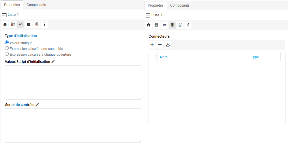 Les propriétés de chaque formulaire sont affichées lors de sa sélection dans l’interface.