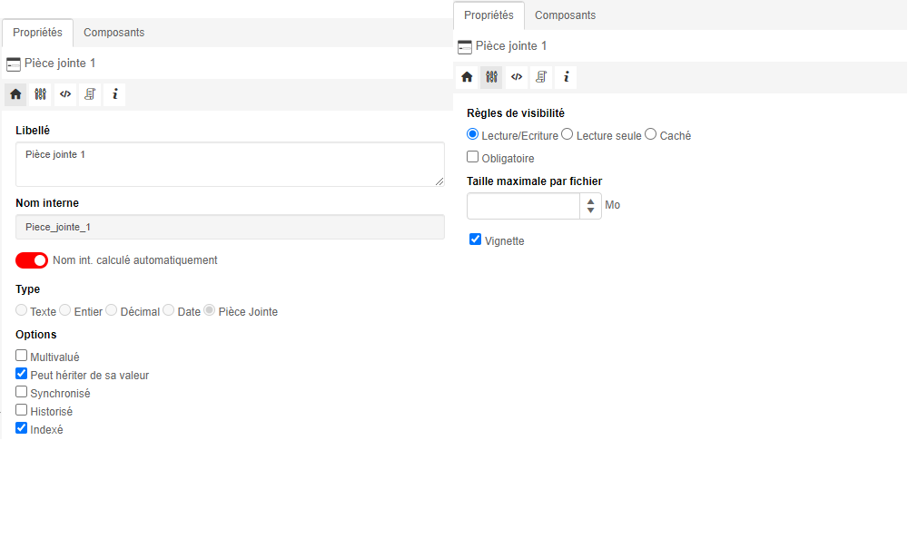 Son type est obligatoirement pièce jointe.Ce champ peut avoir une valeur par défaut vide ou prédéfinie que l’utilisateur n’aura pas nécessairement besoin de modifier.Il peut être présenté en lecture seule ou en écriture. On peut aussi le définir comme obligatoire, le formulaire ne serait pas soumis si sa valeur était vide.