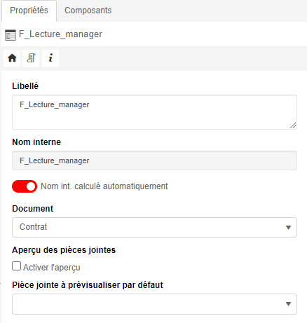 Nom calculé automatiquement : Coché par défaut, cette option permet de garantir l’unicité des noms d’objets.Document : Permet de sélectionner le document associé au formulaire. Par défaut c’est le document pour lequel est défini le formulaire