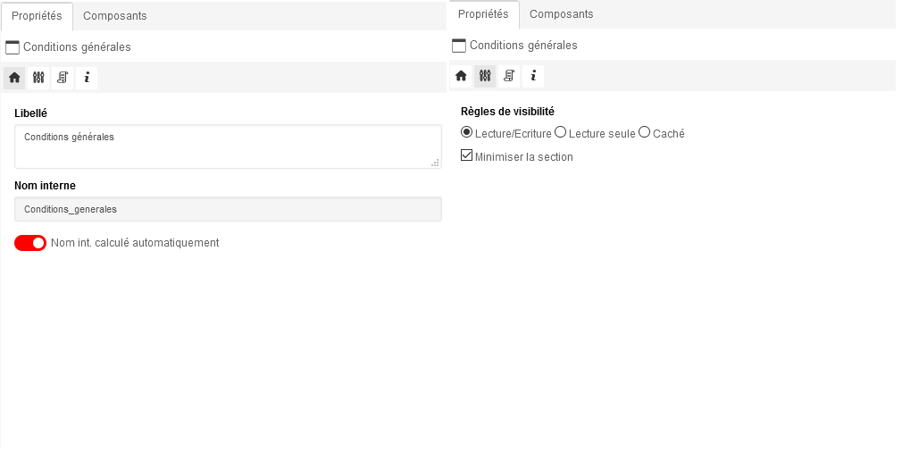 - les règles de visibilité de la section, et donc des différents champs qui la compose