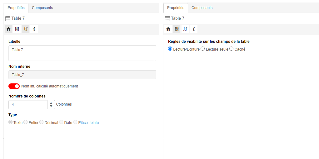 Pour aligner des champs horizontalement vous pouvez utiliser le composant table. Une table peut intégrer tous les composants par glisser déposer à l’exception :