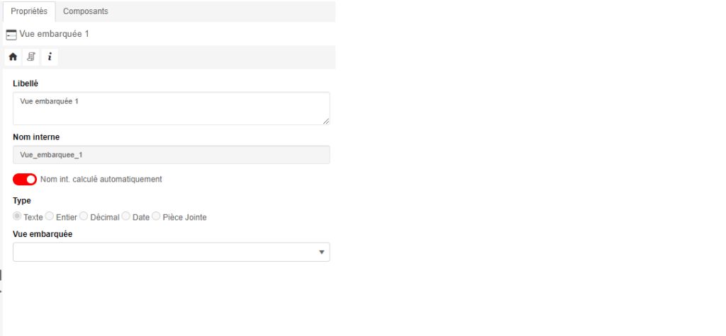 Le champ Vue embarquée permet de réserver dans un formulaire l’emplacement pour une vue construite dans une procédure. Il peut être présenté en lecture seule ou en écriture ou caché à l’affichage.