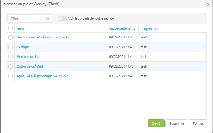 Une fenêtre s’ouvre et vous propose les projets en Flash que vous avez enregistrés sur le serveur Workey.