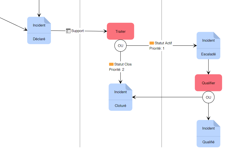 Dans notre exemple, nous désirons aiguiller le document incident de façon automatique vers l’état escaladé ou vers l’état clôturé lorsque le Support niveau 1 exécute l’opération traiter.