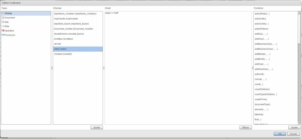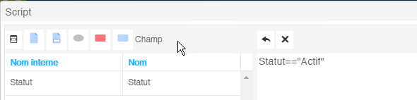 Cliquer sur le champ Statut dans la colonne. Modifier ensuite l’expression pour spécifier une valeur égale à la chaîne “Actif”.