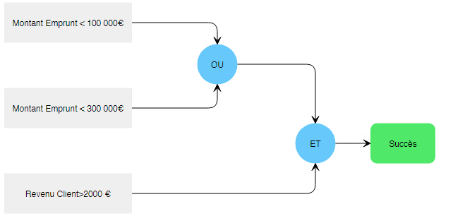 L’interprétation de cette expression logique est simple : Si le MontantEmprunt est inférieur à 100000, ou s’il est inférieur à 300000 mais que le RevenuClient est plus élevé que 2000, alors la règle est vérifiée.