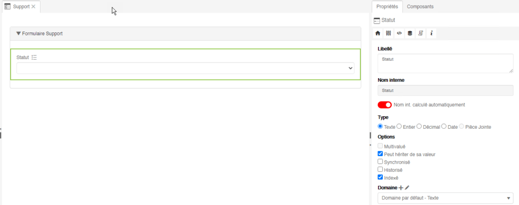 Pour se faire, insérons dans le formulaire Support un champ “statut” qui permettra à l’utilisateur de choisir une valeur “Incident clos” ou “Incident actif”. En fonction de la valeur choisie par le représentant du support pour ce champ, le document pourra atteindre l’état clôturé ou l’état escaladé. Les objets Bouton radio, Liste, Liste à cocher ou Liste déroulante permettent d’implémenter facilement un tel champ.