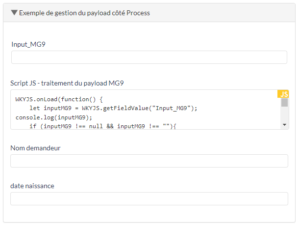 MG9 envoie à Efalia Process un payload sous la forme d’un json stringifié placé dans un champ décidé en amont (celui paramétré côté MG9).