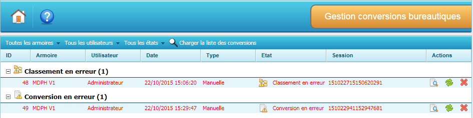 Il est possible d’appliquer des filtres pour rechercher les conversions en fonction de l’armoire, de l’utilisateur et/ou de l’état de la conversion.