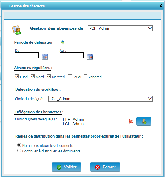 Cette fonctionnalité permet à un utilisateur d’accéder pendant une période définie aux bannettes et aux actions du workflow d’un autre utilisateur absent. La période est définie par l’utilisateur absent avant son absence programmée.