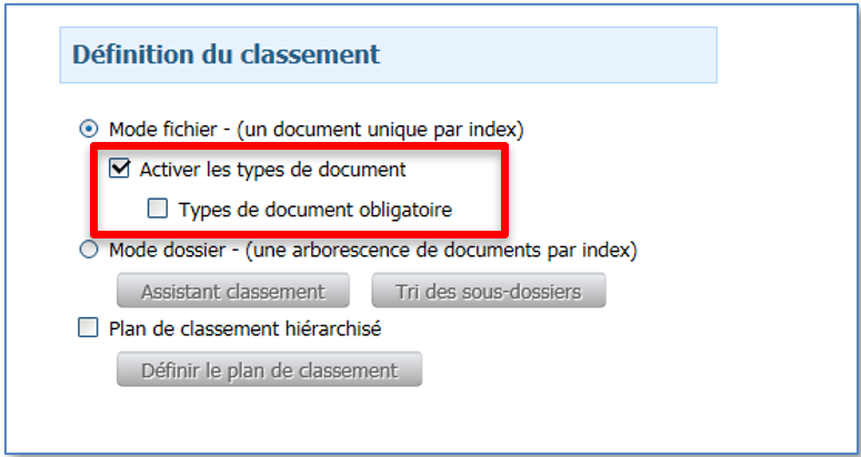 Il est possible de rendre obligatoire la saisie des valeurs des Types de document lors de la configuration de l’armoire en mode fichier.