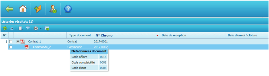 Les documents liés par le type de document peuvent être affichés lors de la recherche, cette liste se présente sous forme d’arborescence.