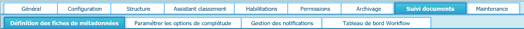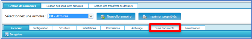 Lors de la création de l’armoire sélectionner le « Mode fichier » et aller sur l’onglet « Suivi documents » (Cf. Onglet suivi de documents). Créer la(les) fiche(s) de métadonnées souhaitée(s).