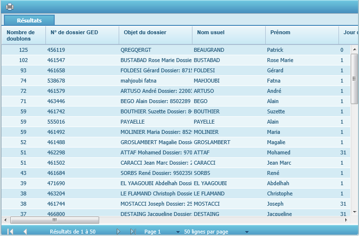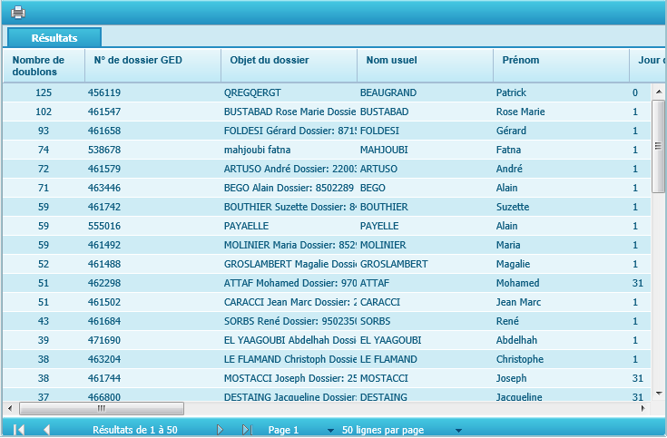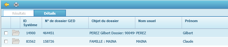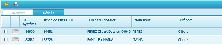 Le nom ou les valeurs saisies permettent de faire en premier lieu une vérification sur l’unicité du dossier de travail à créer et dans le cas de correspondances, de proposer ou d’opérer automatiquement, en fonction de l’option de réouverture automatique, une réouverture du dernier dossier clos.