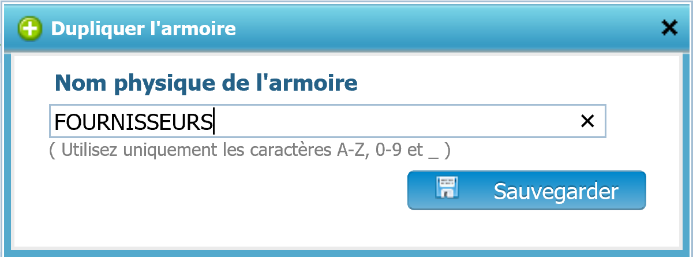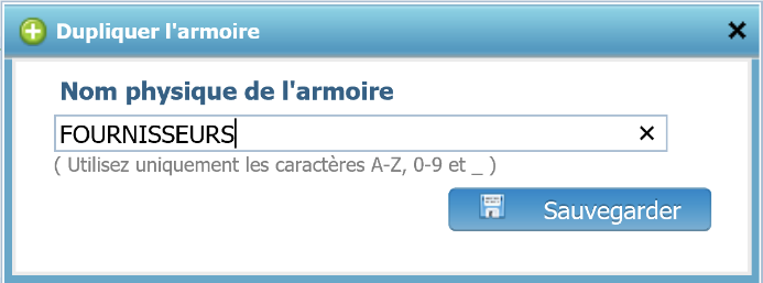 Comme dans le cas de la création d’une armoire, un nom physique est nécessaire. Celui-ci doit respecter des critères précis, il doit comporter uniquement des caractères alphabétiques et en majuscules.