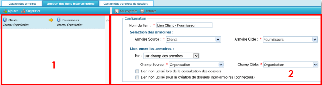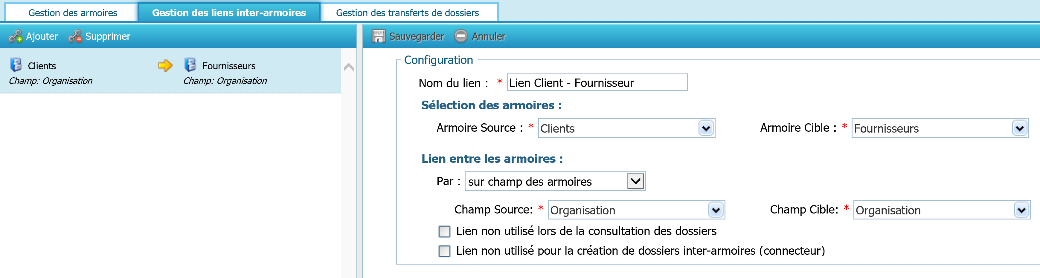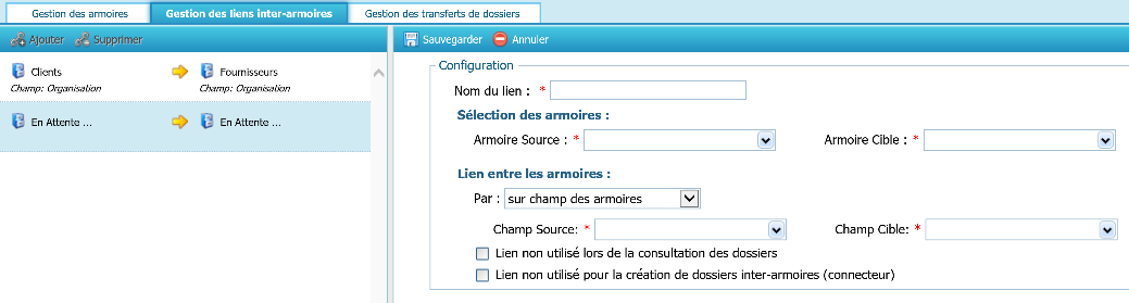 Lien inter-armoire : Sélection du lien inter-armoire sur lequel la règle va s’appuyer pour le transfert des dossiers