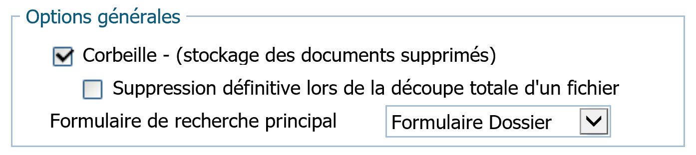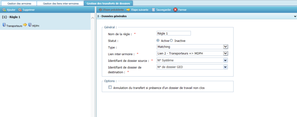 Options : Annulation du transfert si présence d’un dossier de travail non clos Si coché, permet de respecter cette règle (pas de transfert tant que des dossiers de travails existent)
