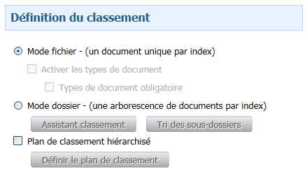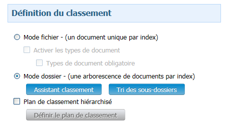 Si on sélectionne le mode dossier (une arborescence de documents par index), nous avons la possibilité de créer un assistant classement.