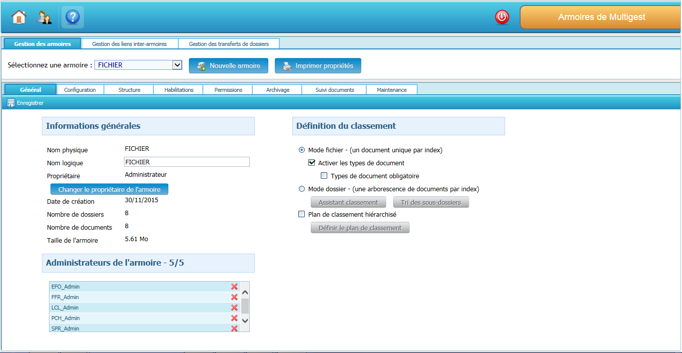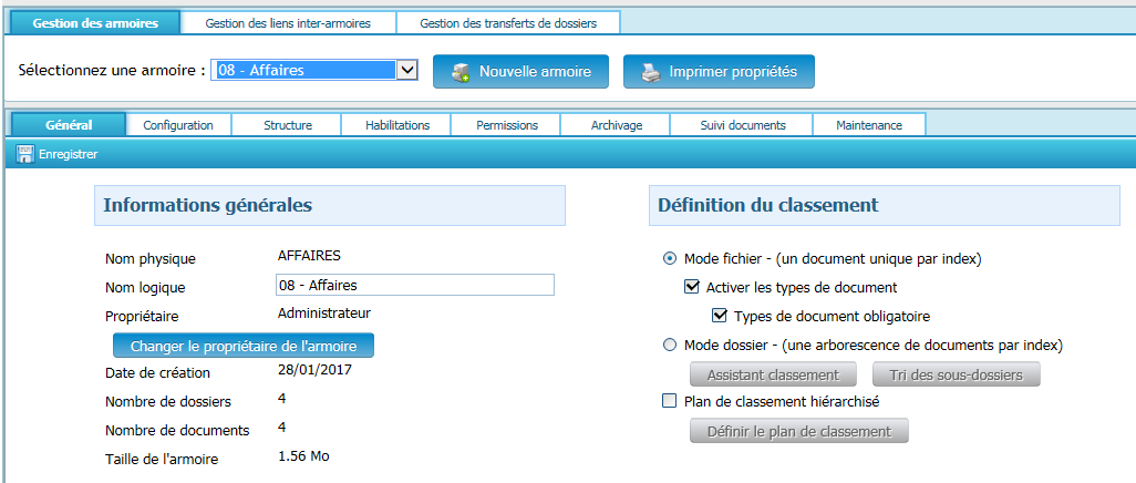 Lors de la création d’une armoire en mode fichier il est possible de définir un type de document.