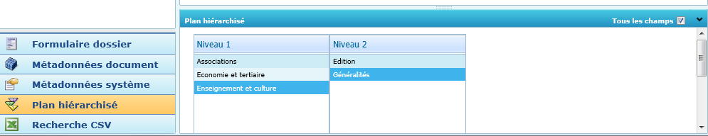Il est donc possible de faire une recherche détaillée sur les différents niveaux du plan de classement en affinant son résultat de recherche par sélection des niveaux.