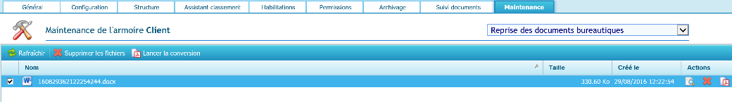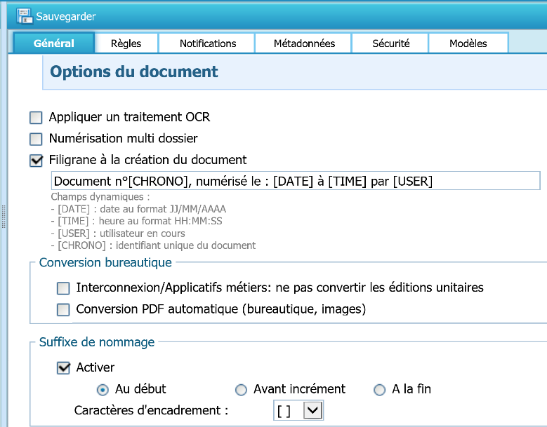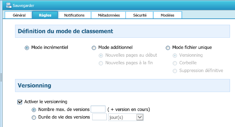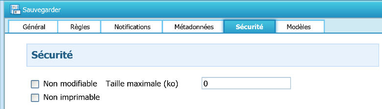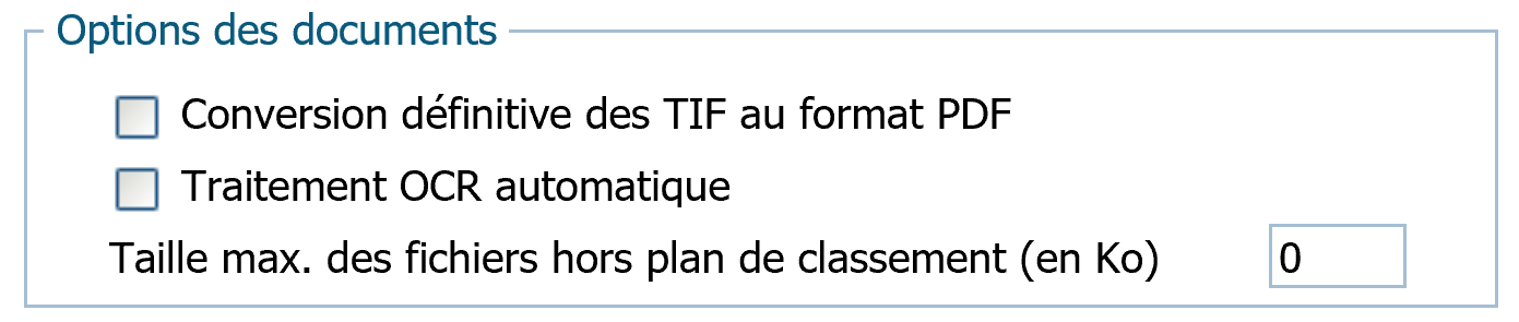 Taille maximum des fichiers hors plan de classement : Permet de définir une taille maximum pour les fichiers non prévus dans le plan de classement (Par défaut, 0 indique que la taille n’est pas limitée)