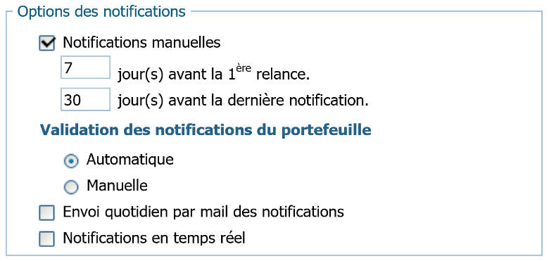Cette interface permet de définir les options proposées dans le cadre de l’utilisation des notifications dans Multigest :