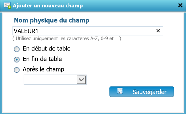 - En fin de table : Le champ sera inséré à la fin de la description de la structure