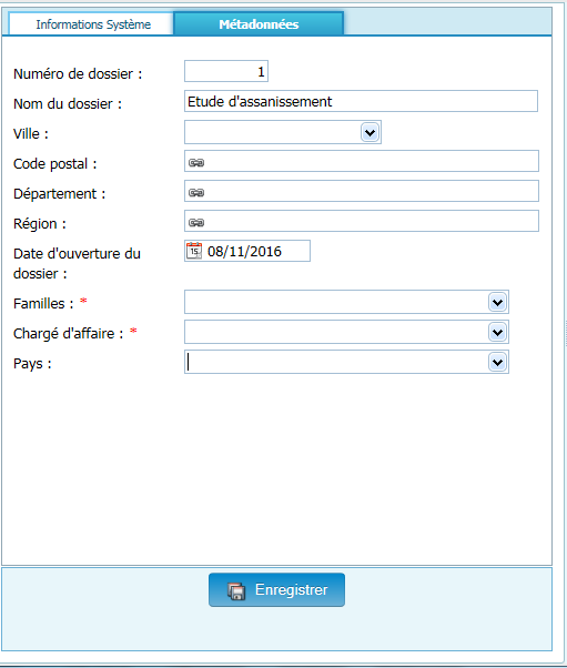 La recherche d’existence d’un dossier de travail est faite sur l’ensemble des métadonnées saisies.