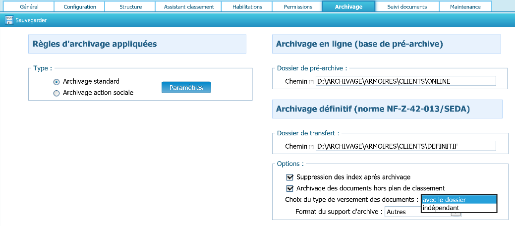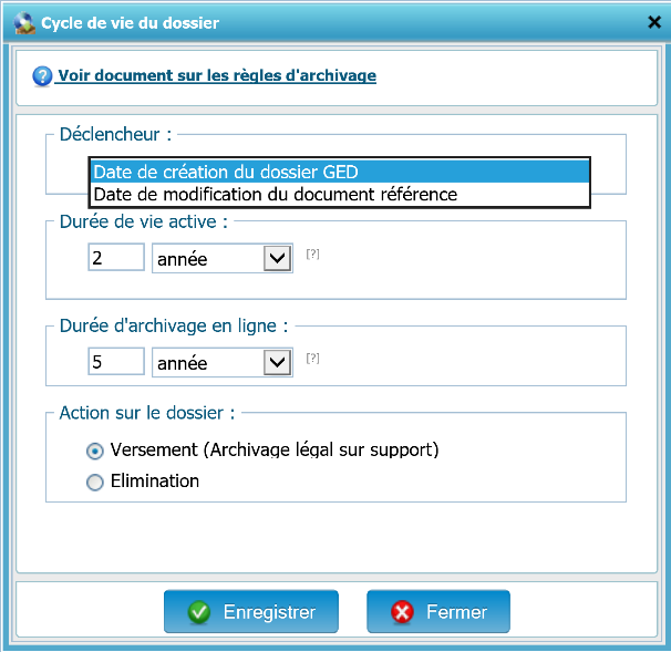 L’archivage des actions a trois paramètres : l’armoire concernée, le délai avant l’archivage, le type d’objet à archiver.